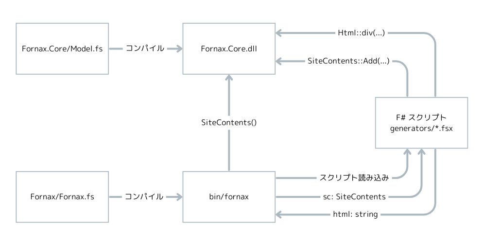 下図は、Fornax 本体、Fornax.Core, F# スクリプトの間のやり取りを可視化しようとしたものである……が、分かりやすくはない自覚はある。データのやり取りや制御の流れをすべて矢印で表現してしまっている。もうちょっと分かりやすい図を作りたかったのだがうまく図解できなかった。しかしとにかく、コンパイルされた F# プログラムと F# スクリプトの間でオブジェクトがやり取りされる衝撃をなんとか共有したい……!
